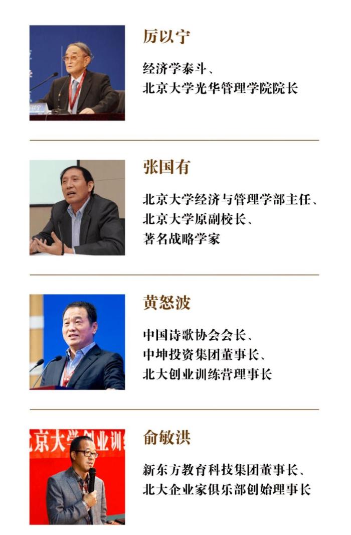 结合北大优势教育资源及校友资源,针对创业者实战经营、思维创新、管理提升等不同维度,打造最权威的创业教育课程体系。目前,北创营已累计完成150门课程的开发和讲授。部分课程如下: